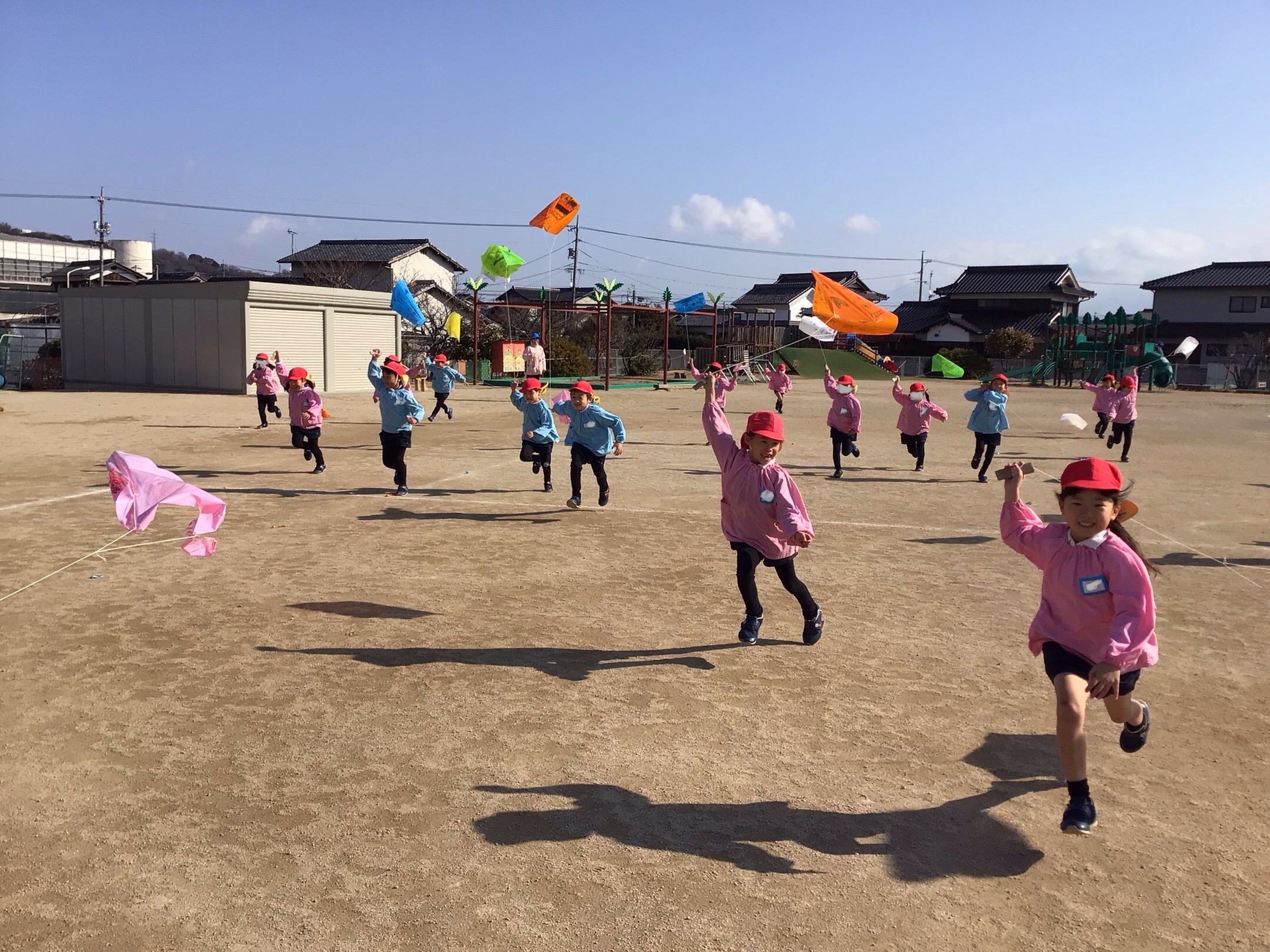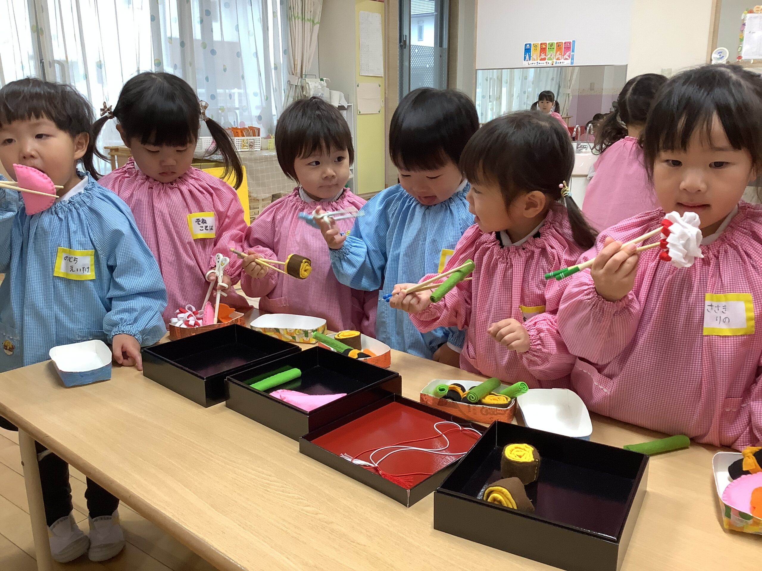 TOP > おせち料理で箸遊びをしたよ(満3ひまわり) アーカイブ : 2026年 おせち料理で箸遊びをしたよ(満3ひまわり) 布で作った手作りのおせち料理を使って箸遊びをしています。給食ではスプーンからお箸を正しくもてるように頑張っています。楽しんで練習できるようにお重箱に入れて雰囲気を出しました。たくさん食べることができるかな? 2026.01.13 ブログ たこあげ 3学期がはじまりました。 子ども達も元気に登園してます。今日は年長さんが園庭で凧揚げをしていました。とっても広い園庭なので、いっぱい走りまわりました。 2026.01.13 ブログ 1 / 11